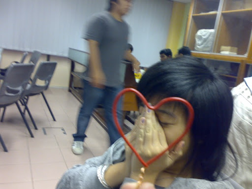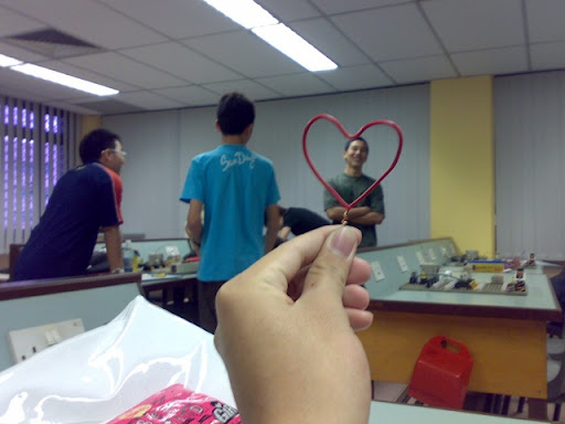EEPS today was damn fun! Cos we had insulator war in class. Everyone in the class was cutting the insulation away from the wires n throwing it at each other...n it became so intense that the whole floor was filled with insulation...N during class Jac started to Camwhore with the heart that i made using the wire...n she was FORCING everyone to take pic with it as well -___-