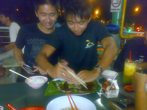 10:45 PM♥As usual AEL lecturer is cursing me to stay back for this module! Hopefully i will do damn well n see him feel all stupid for saying so much crap! Anyway wednesday i oso cant rmb wad happened! SSo yea went for training n yea, went to eat with the club. Below is a pic of Alvin trying to hide evidence of the sambal stingray he shared with Kevin...those two sly foxes!!!