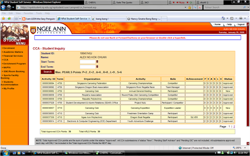 Today super slack. I came to class like 40 mins late n watched videos from Youtube all the way from 9-12. Had lunch at Can 3 before heading with Adam, Donny n Markus to the Canoeing CCA booth. walked n looked arnd b4 going for class. Our class finished in 1 1/2 hour, 3 1/2 hr ahead of time! Damn shiok! Slacked abit in Atrium looking at the diff CCA showcases with the class. Wanted to see ephraim damnce but missed it. Maybe tml when i go tend the booth that time can see!